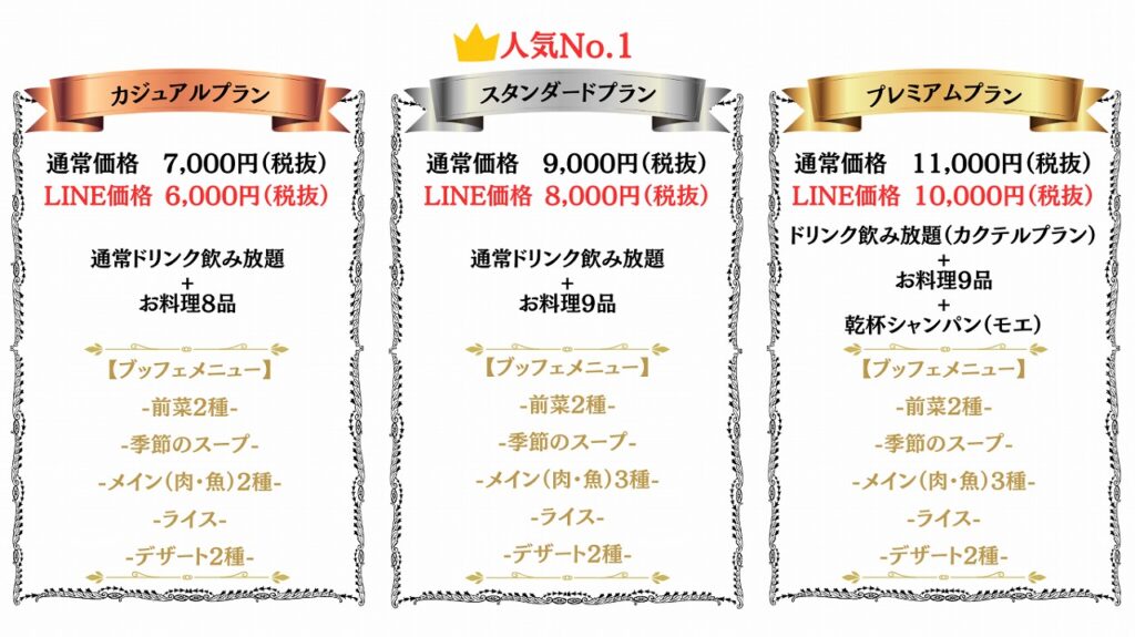 ※上記金額には、お食事、飲み放題、スペース利用料のすべてが含まれております。
